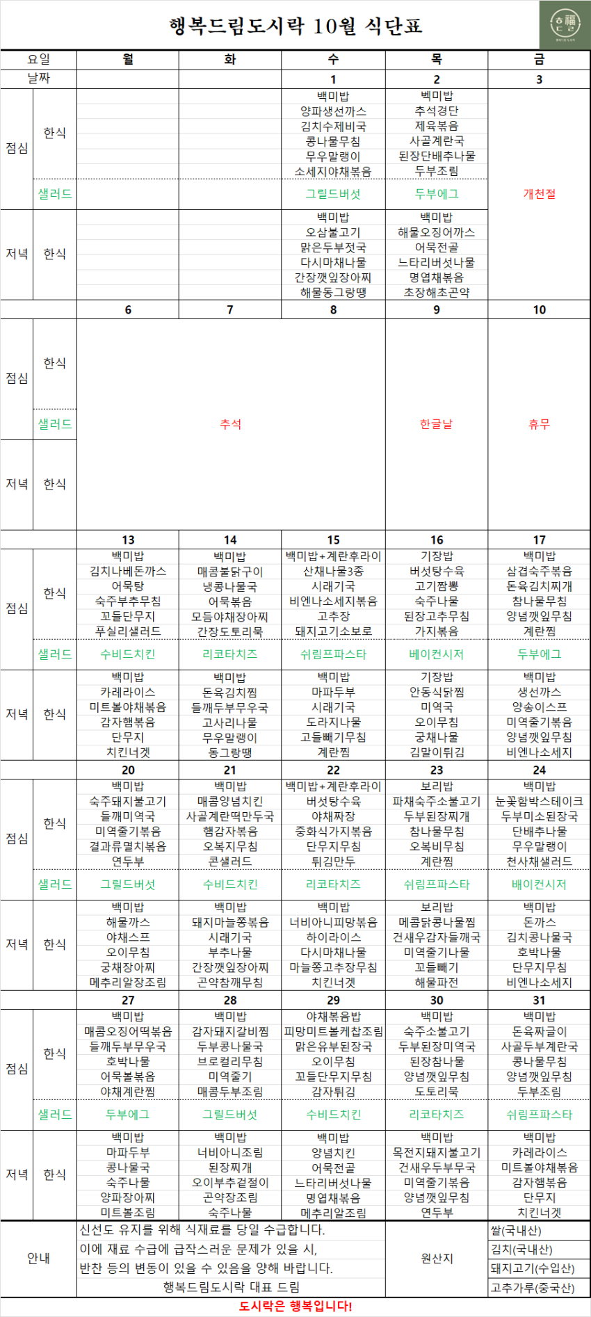 월~금 점심과 저녁 도시락이 공급됩니다.